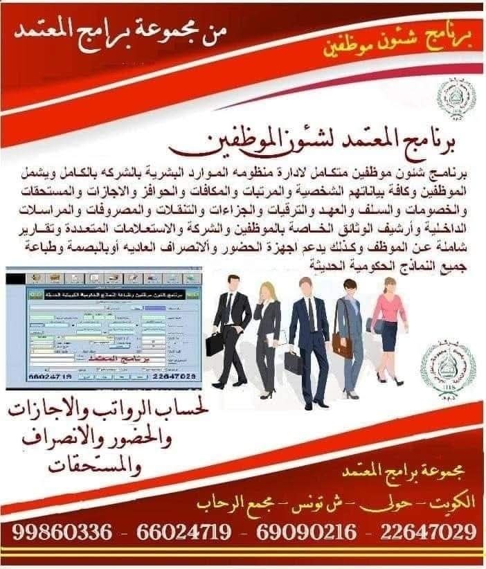 برنامـج شئون موظفين متكامل لادارة منظومه الموارد البشرية بالشركات الصغيرة والمتوسطة والكيبرة بالكامل وشركات توصيل الطلبات ويشمل الموظفين وكافة بياناتهم الشخصية والمرتبات والمكافات والحوافز والسلف والاجازات والمستحقات ونظام الحضور والانصراف والاضافى والخصومات والعهـد والترقيات والجزاءات والتنقـلات والمصروفات وبيانات السيارات وتسليمها للموظف واستلامها منهم وصيانتها ومصروفاتها والمخالفات والمراسلات الداخلية بين المستخدمين وأرشيف الوثـائق الخاصة بالموظف والشركة والاستعلامات المتعددة وتقـارير شاملة عـن الموظف والشركة والفروع وكذلك يدعم اجهزة الحضور وألانصراف العاديه أو بالبصمة وطباعة جميع النماذج الحكومية الحديثة مع تنبيه بنتهاء الاقامات والجوازات وكروت الصحة والاجازات والتراخيص التجارية والعديد من الوثائق الأخرى للموظف والشركة