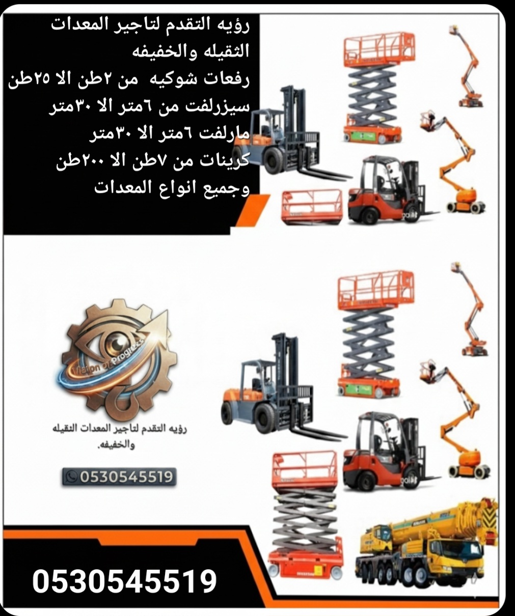 #رؤية_التقدم #معدات_ثقيلة #إيجار_معدات #مقاولات_السعودية #رافعة_شوكية #رافعة_مقصية #ونش #مشاريع_بناء #إنجاز_بلا_حدود #حلول_لوجستيةشركة رؤية التقدم هي شريكك الأفضل لتأجير أحدث المعدات الثقيلة في المملكة! نضع بين يديك أسطولاً جاهزاً للعمل يضمن لك السرعة والأمان والكفاءة العالية في موقعك. تشمل معداتنا: الرافعات الشوكية (Forklifts): لسهولة المناولة والتخزين. الرافعات المقصية (Scissor Lifts): للوصول الآمن والمستقر للارتفاعات المتوسطة. الرافعات الذراعية (Boom Lifts): للعمل في أصعب الزوايا والمساحات. الرافعات الثقيلة (الأوناش/Cranes): لحمل ورفع الأحمال الضخمة بدقة. لماذا رؤية التقدم؟ خدمة 24/7، صيانة دورية، وفريق دعم محترف مستعد لخدمتك. مشروعك يبدأ بقوة مع رؤية التقدم! 📞 تواصل معنا الآن للحجز والاستفسار0530545519
