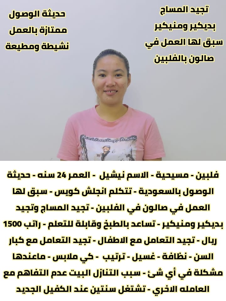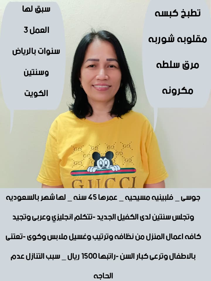 “نقدم خادمات منازل ذوات خبرة وكفاءة عالية للعمل في المنازل السعودية. خدماتنا تشمل تنظيف المنزل، رعاية الأطفال، والطبخ. جميع الخادمات مدربات وذوات سيرة ذاتية ممتازة.