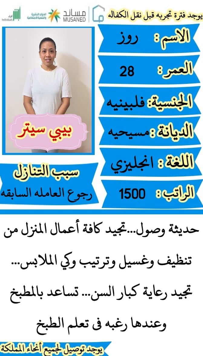 نحن نوفر لك خادمات ✨للتنازل يتميزن بالخبرة العالية 🌟في العمل المنزلي والرعاية🌟 الصحية، مدربات 🌟بعناية لتلبية احتياجاتك بمهنية ودقة. معنا، ستحصل على✨الكفاءة التي✨ تبحث عنها لضمان✨ راحة أسرتك. لا تدع هذه الفرصة ✨تفوتك، تواصل معنا✨ الآن لتبدأ تجربة ✨جديدة مع✨خدمة ترتقي✨ لمستوى توقعاتك!”0578052462