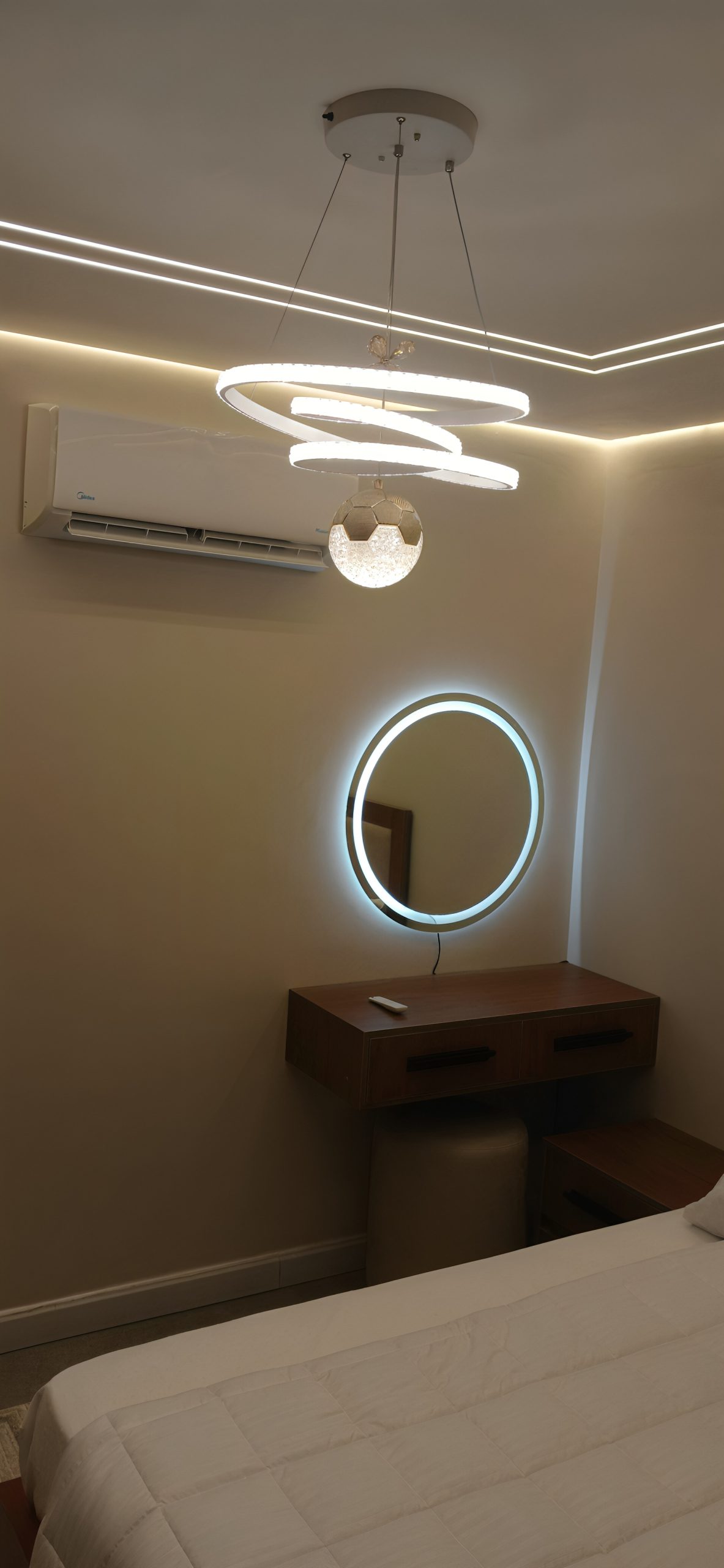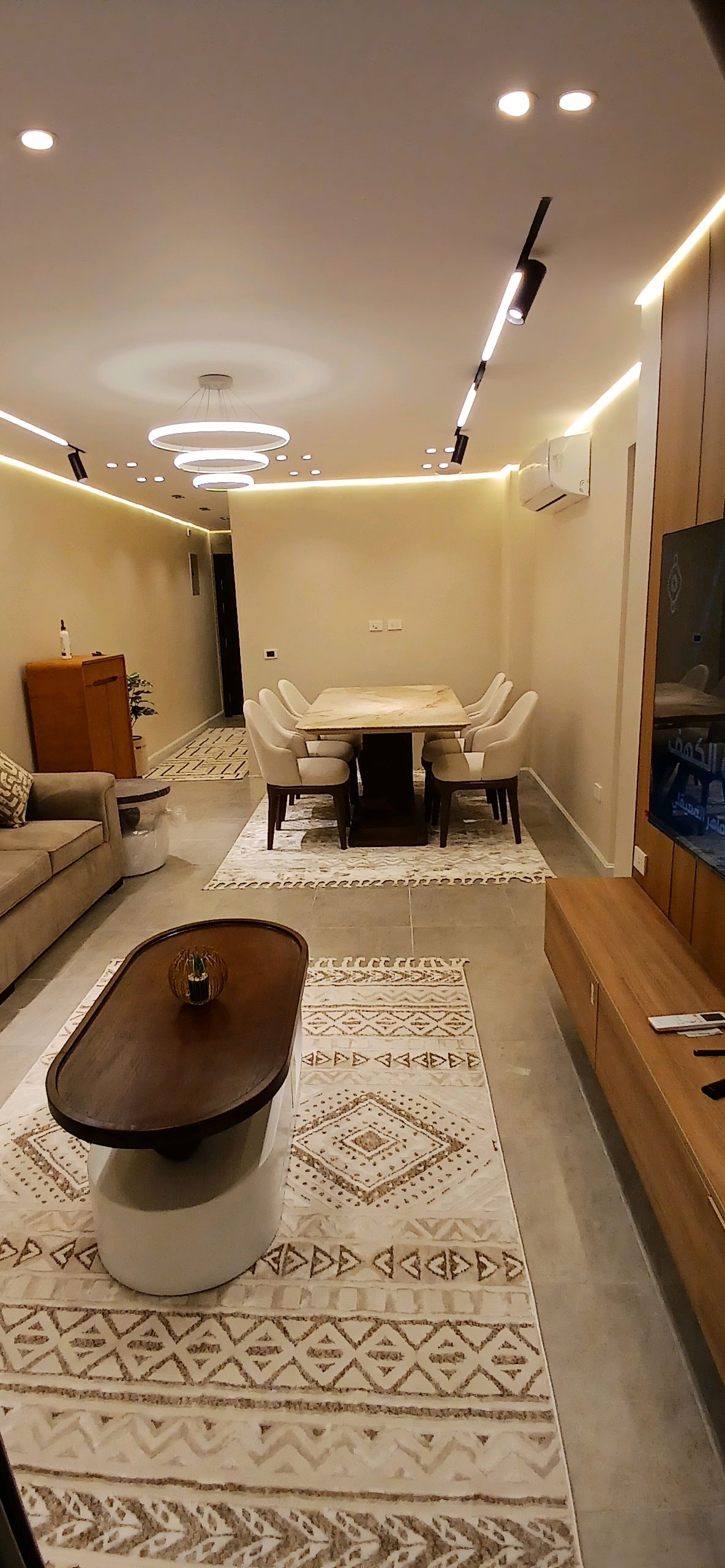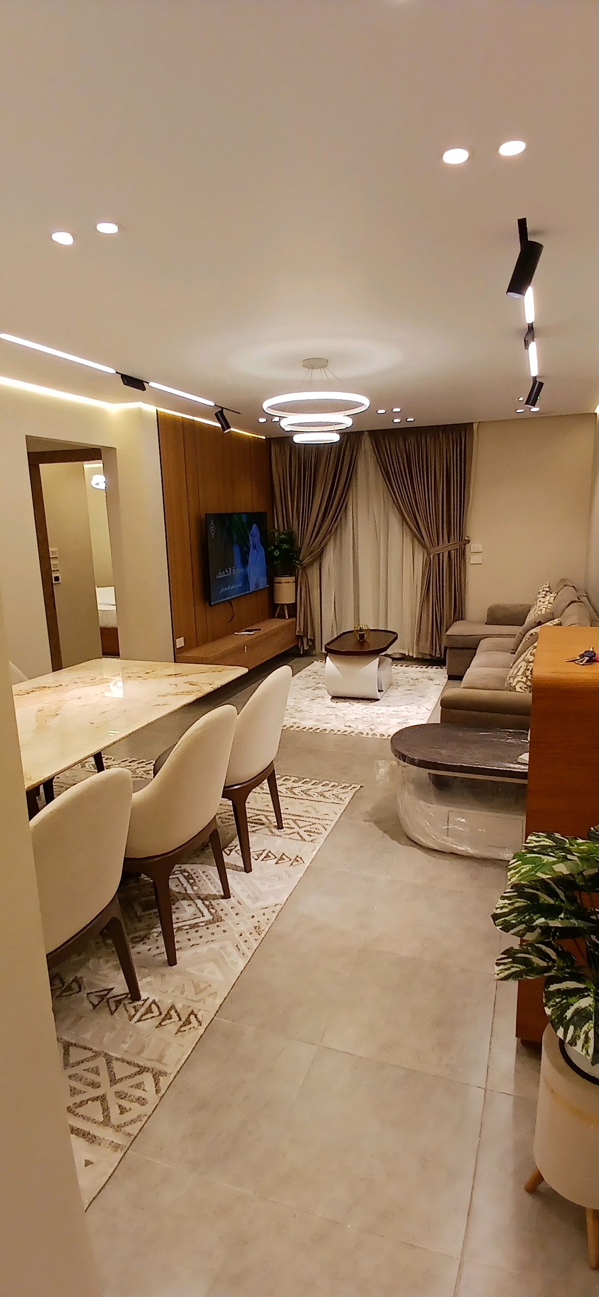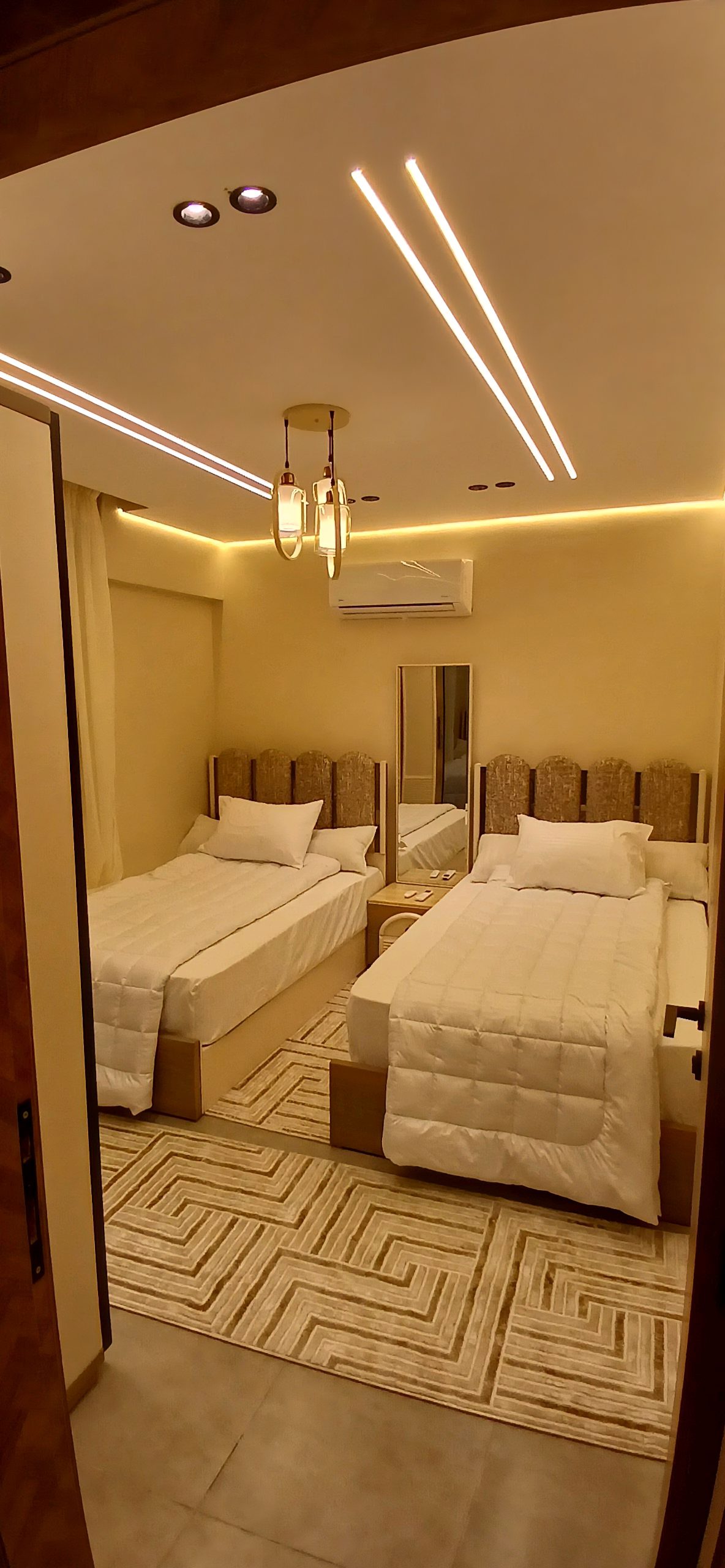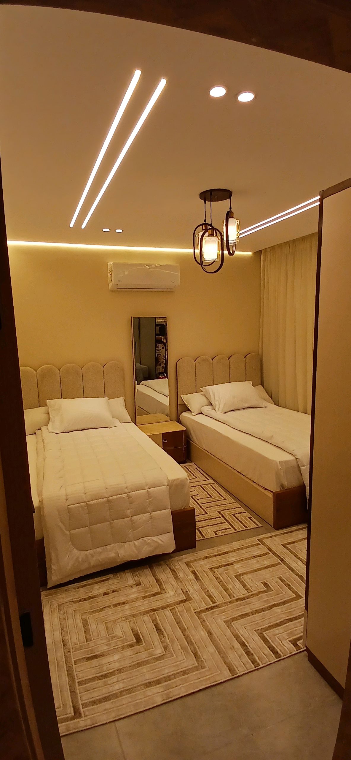الشقة تتكون من ثلاث غرف نوم وصالة كبيرة بديكور عصري وإضاءة مريحة، بالإضافة إلى مطبخ مجهز بالكامل يحتوي على ثلاجة، غسالة، ميكروويف، وأواني طهي كاملة.