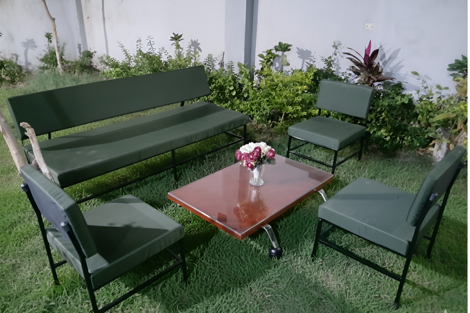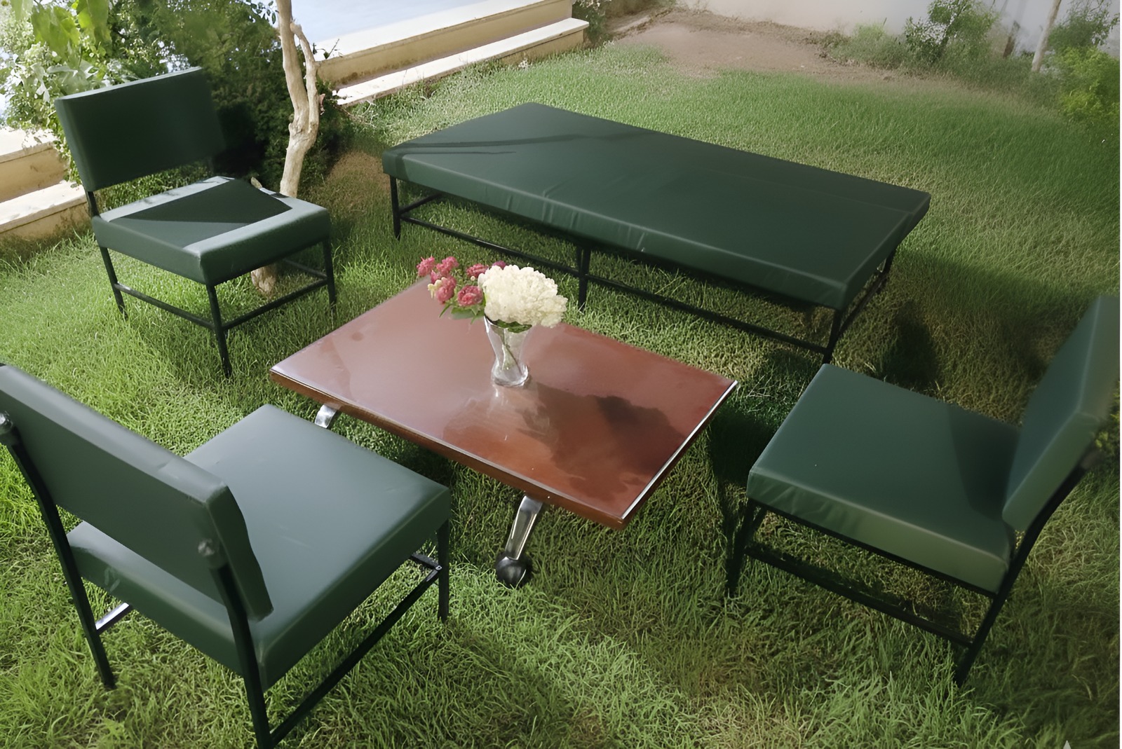 طقم جلوس حديد خارجي لحدائق الفيلات والقصور مصمم لتحمل الاستخدام الخارجي والظروف المختلفة ومكون من خمس قطع كنبة حديد كبيرة تفتح سرير 3 كراسي حديد ترابيزة حشب طبيعي بارجل استنالس لامعة ومضادة للصدأ التنجيد: خامة وتر بروف باللون الأخضر الداكن (الزيتي) م...