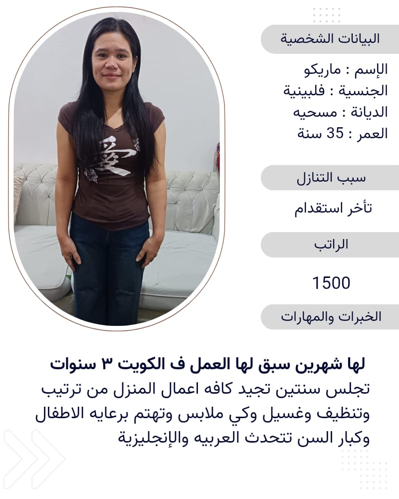 ✨ ✨ 🚨 متوفّرة الآن عاملة منزلية جاهزة للعمل فوراً عندنا تيزا، عمرها ٢٨ سنة، بنجلاديشية، مسلمة… اشتغلت قبل ولها خبرة طيبة داخل السعودية.0545936374 🍽️ شغّالة تعرف تطبخ أكلات محلية وآسيوية: برياني، كبسة بسيطة، سمبوسة، ملوخية، ومعجنات – شغل مرتب ونظيف. 🏡 ممتازة بأعمال المنزل: تنظيم – ترتيب – غسيل – كوي وتعرف تتعامل مع الأطفال وكبار السن بطريقة محترمة وهادية. ⏳ مدّة العمل السابقة: سنة ونص داخل المملكة. سبب التنازل: تأخير الاستقدام فقط – ما فيه أي ملاحظات على شغلها. 💸 الراتب: 1200 ريال 🔖 جاهزة للتنازل الفوري 📞 للي جادّين فقط… التواصل خاص ومرحّب بالجميع 🌟 العرض محدود وما يتكرر!0545936374