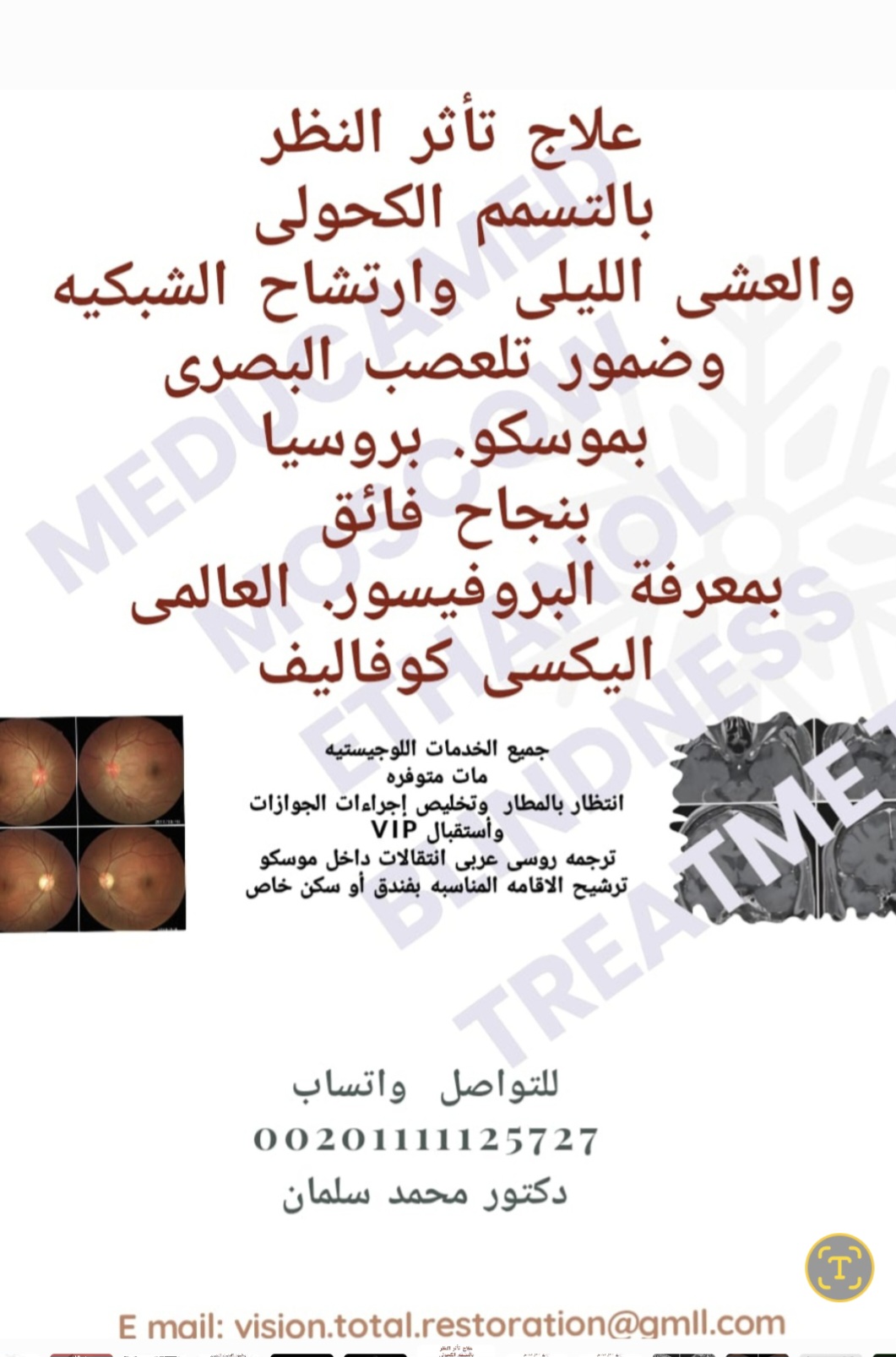 باحدث علاج فى العالم نبتكولوجيا العلاج المناعى الجينى الخلوى لعلاج تلف الشبكيه والعصب البصرى ومركز الابصار بالمخ نتيجة التسمم الغذائي والكحولى بنوسكو بنجاح ساحق