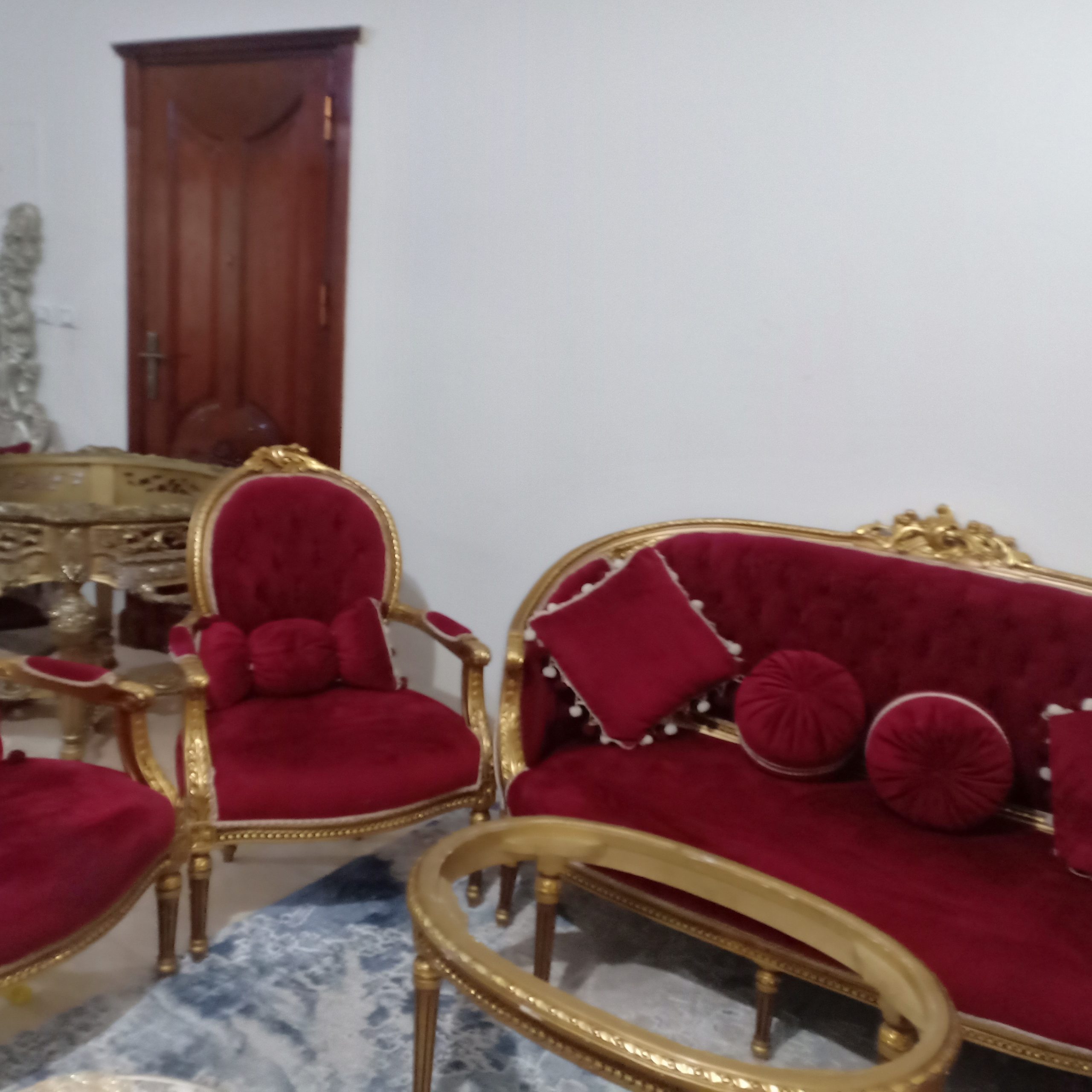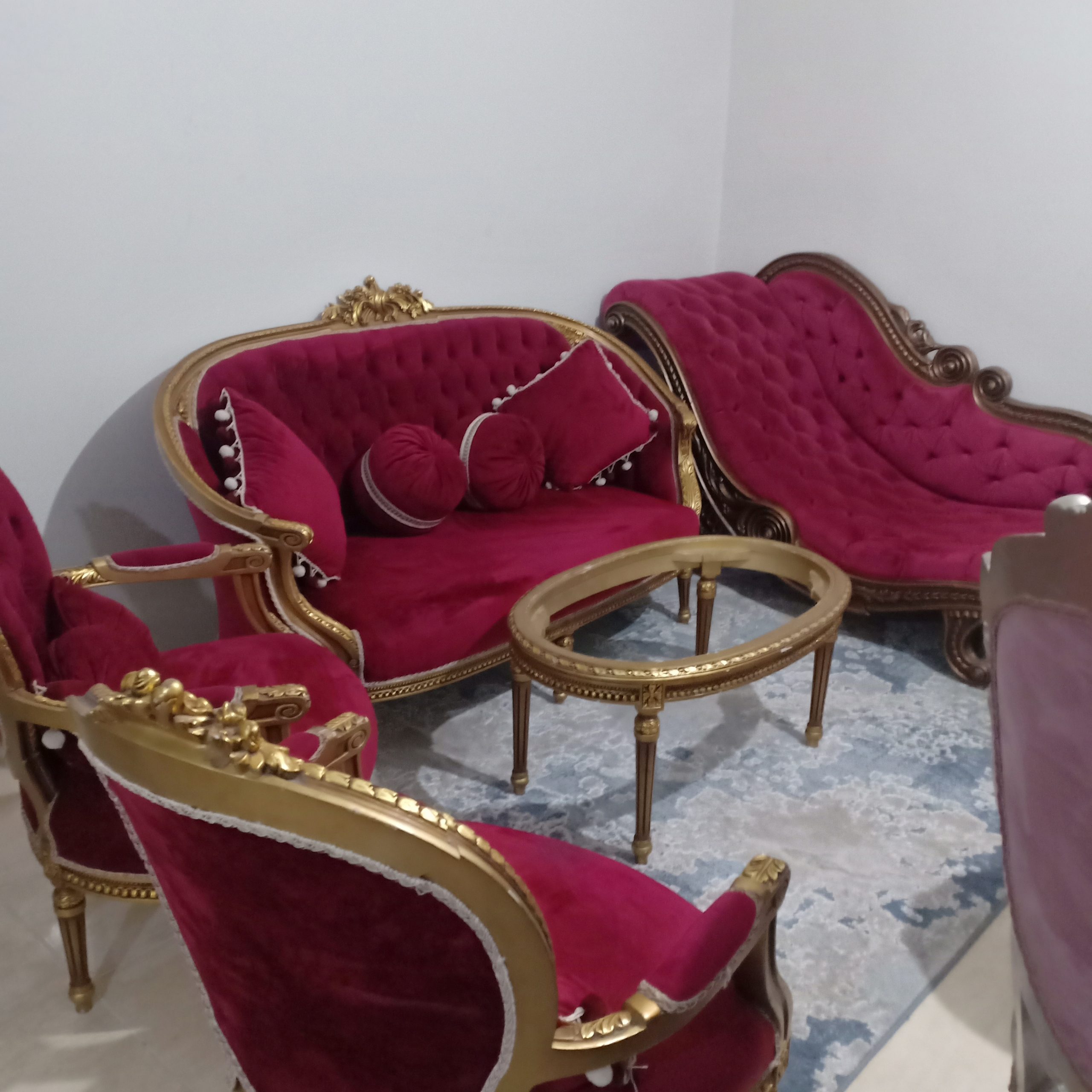 طقم كنب احمر مع شازلونج. وطاوله شبه جديد خشب زان عموله دمياط