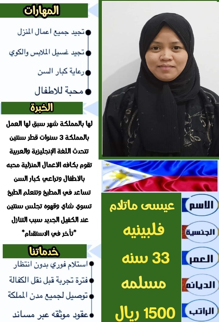متوفر عماله منزليه وطباخات ومرافقين لكبار السن وعاملات نظافه ومربيات اطفال وكوافيرات وسائقين ومتاح التجربه لكل أنحاء المملكه والتجربة خير برهان 🇸🇦🇸🇦