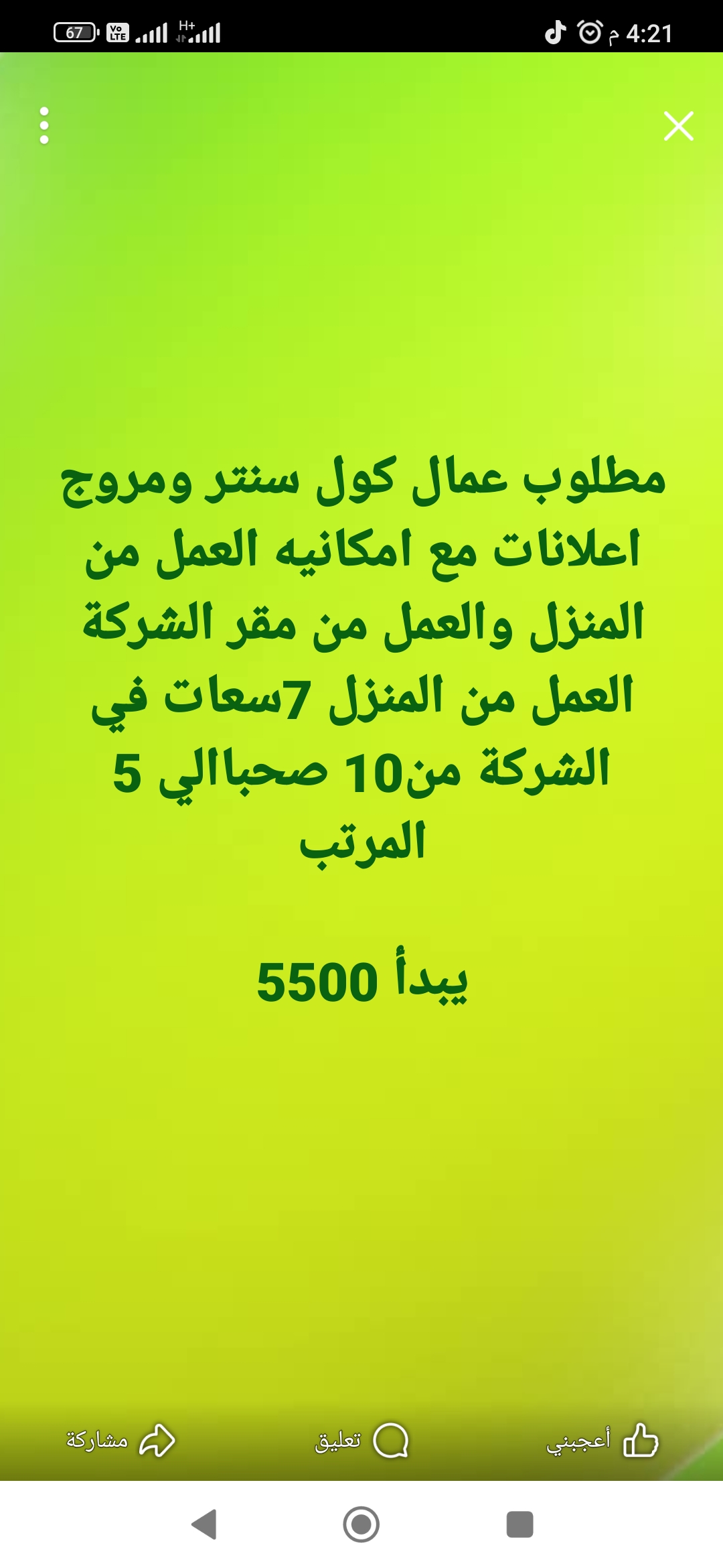 مطلوب عمال كول سنتر ومروج اعلانات مع امكانيه العمل من المنزل 7سعات من مقر الشركة من10 صحباالي 5 الراتب يبدأ 5500