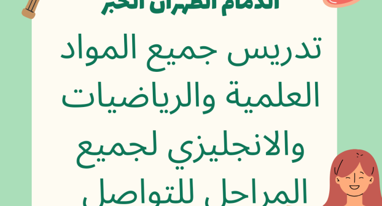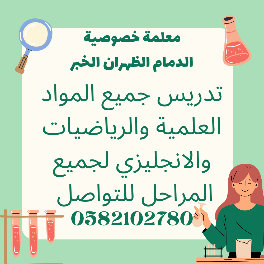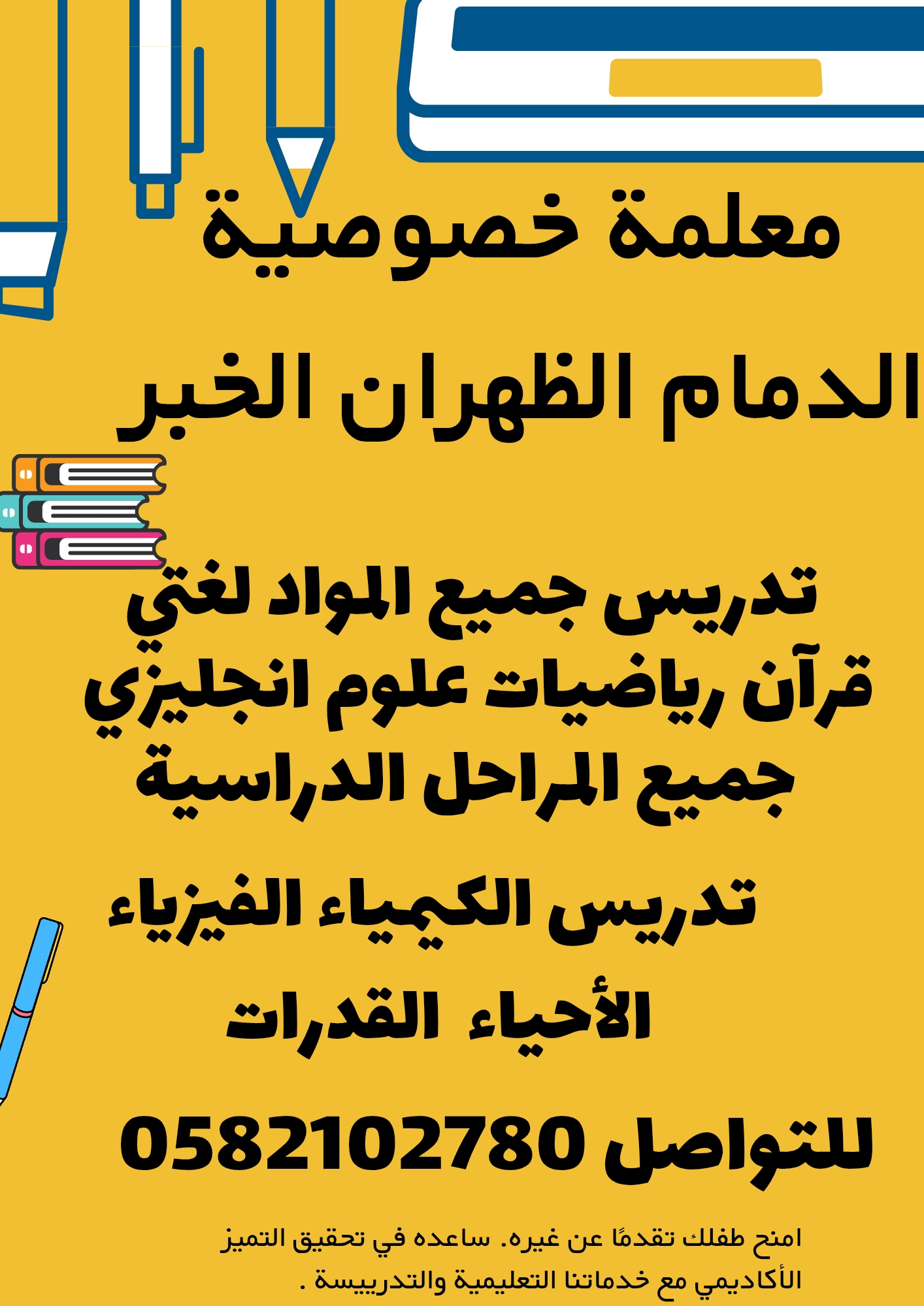 معلمه خصوصيه الدمام الظهران الخبر نخبة من أفضل المعلمات المتميزات المتخصصات في كل المواد وجميع المراحل ابتدائي متوسط ثانوي جامعه انجليزي لغتي رياضيات علوم قرآن كيمياء فيزياء أحياء قدرات كمي ولفظي التزام بالمواعيد معلمه تجي البيت اسعار مناسبه حضوري للتواصل واتساب 0582102780